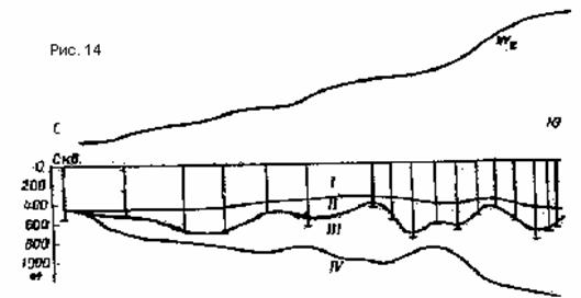 На рис. 14 приведен профиль через залежь богатых руд по простиранию Лучковской полосы в Белгородском районе KMA. Возрастание силы тяжести при движении по профилю к югу связывают с погружением замка синклинальной складки и с увеличением мощности толщи железистых кварцитов III , залегающей на подстилающих породах IV. Локальные минимумы силы тяжести приурочены к зонам уменьшения мощности толщи III. Оказывается, что над этими зонами рудное тело II имеет максимальную мощность и отмечается минимумами ZA. Мощность толщи покрывающих осадочных пород I достигает 500 м. Рудное тело разведано семнадцатью буровыми скважинами. [1] 3. ГЕОДЕЗИЧЕСКИЕ РАБОТЫ ПРИ ВАРИОМЕТРИЧЕСКОЙ СЪЁМКЕ