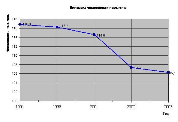 О динамике численности населения можно сделать вывод о том, что спад обусловлен по большей части эмиграцией. По данным Облкомстата за период с 1991 по 2003 год численность населения города является непостоянной и колеблется в пределах от 116,8 до 106,3 тыс.чел. Основную массу населения составляют люди трудоспособного возраста от 16 до 60 (более 40 % от общей численности населения). Из анализа полученных данных прослеживается, что численность трудоспособного населения возрастает.
