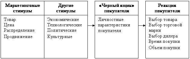 На рисунке слева показаны основные маркетинговые стимулы – так называемые четыре «р» (product, price, place, promotion): первые буквы английских названий основных маркетинговых мер воздействия на рынок: (товарная политика, ценовая политика, политика формирования каналов сбыта и товародвижения, политика продвижения, т. е. формирования спроса и стимулирования сбыта). В группу других стимулов включены основные факторы окружающей покупателя среды – экономические, технологические, политические и культурные. Все эти стимулы попадают в «черный ящик» покупателя, где они преобразуются в определенные решения, которые можно видеть на схеме справа, а именно: выбор товара, торговой марки, дилера, времени и объема покупки. «Черный ящик» покупателя состоит из двух отделений – личностные характеристики самого покупателя, влияющие на то, как он воспринимает воздействующие на него факторы окружающей среды, и самого процесса принятия решения о покупке (18, 123).