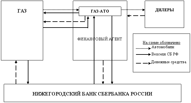 В основе описываемой схемы лежит месячная программа отгрузки автомобилей за векселя Сберегательного банка, ежемесячно согласовываемая и утверждаемая участниками схемы. Для инициализации работы программы банком предоставляется вексельный кредит (кредитование осуществляется в полном соответствии с требованиями Сберегательного банка, в том числе и в отношении обеспечения) Финансовому агенту (ГАЗ-АТО) для осуществления оплаты первой партии отгружаемых автомобилей. Первые несколько дней месячной программы отгрузка Финансовому агенту (далее –ФА) осуществляется без оплаты, с целью обеспечить товарный задел у ФА на начало следующей месячной программы, который позволяет иметь ФА достаточное обеспечение по выдаваемым банком кредитам и осуществлять реализацию автомобилей непрерывно.