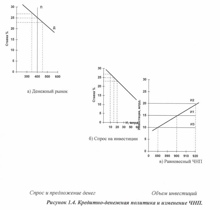 На рис l.4.а изображен денежный рынок, на котором пересечение спроса и предложения на денежные средства определяют равновесную ставку процента. При данном предложении денег, равном 400 млрд.р. равновесная ставка процента составляет 25%.
