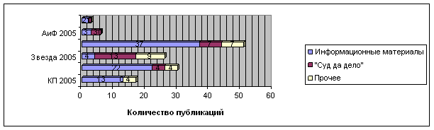 Уточним, что за указанный период 2005 года в «Комсомольской правде» было опубликовано 17 криминальных материалов, в «Звезде» - 24, в «Аргументах и фактах» - 6.