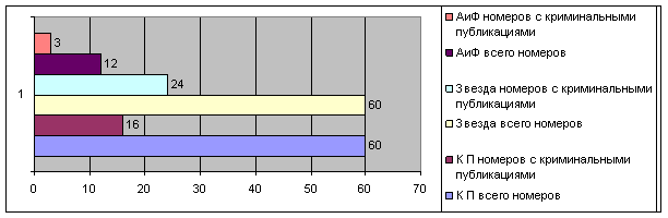 Очевидно, что в 27% номеров «Комсомольской правды», 40% «Звезды» и 25% номеров «Аргументов и фактов» содержались криминальные публикации. При этом надо учитывать, что в некоторых номерах выходило сразу 2, а иногда – 3 материала подобного содержания.