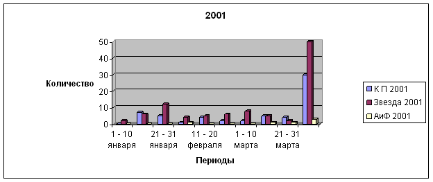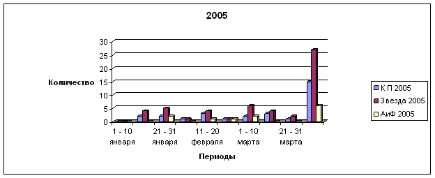 «Звезда» и «Комсомольская правда» - ежедневные газеты (5 номеров в неделю). Значит, допустимо, если в 10-дневный период выйдет 4 – 5 криминальных публикаций. В исследуемый период 2001 года «Звезда» постоянно превышала этот уровень, в 2005 году мы видим только один такой случай (в период с 1 по 10 марта), но количество криминала постоянно приближается к этой отметке. В «Комсомольской правде» сейчас мы видим 3 – 4 публикации за 10 дней, но в 2001 году их количество было примерно равно количеству криминала в «Звезде» в 2005 году. В «Аргументах и фактах» в 10-дневные периоды криминала либо не выходило, либо появлялось по 1 – 2 материала. Теперь можно сделать окончательные выводы.