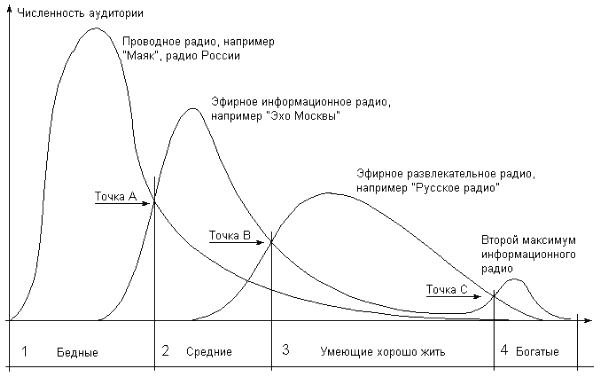 В силу специфики оставшегося со времен СССР парка приемников, проводное радио имеет самую массовую аудиторию. Неудивительно, что его слушательская аудитория простирается через все социальные группы и формой своего графика характеризует экономическое состояние постсоветского общества. Те люди, которые приобрели эфирные радиоприемники (кто-то приобрел их вместе с автомобилем), как правило, перестают слушать «кухонные» репродукторы. Чем более дорогой приемник они покупают, тем больше они его используют.