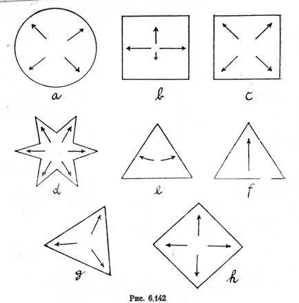 По утверждению Р.Арнаима, такое движение присутствует в форма, представленных на рис. 6.142. Движение происходит в направлении стрелок. При очень краткой экспозиции (е) оно воспринимается как (f) вообще говоря, предпочтение отдается горизонтальным линиям.