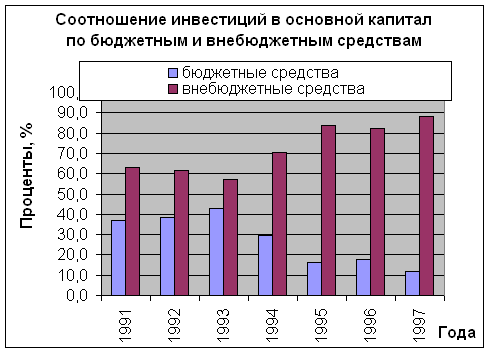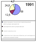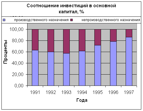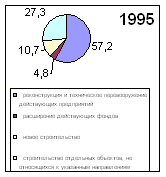 По данным таблицы №3 и диграмм №3 можно констатировать факт перераспределения структуры инвестиций. С 1991 по 1997 год произошло увеличение инвестиций в техническое перевооружение оборудования и строительство неких, возможно, вспомогательных производственных объектов, также произошло сокращение нового строительства и расширения действующих фондов (в связи с тем, что это дорого).