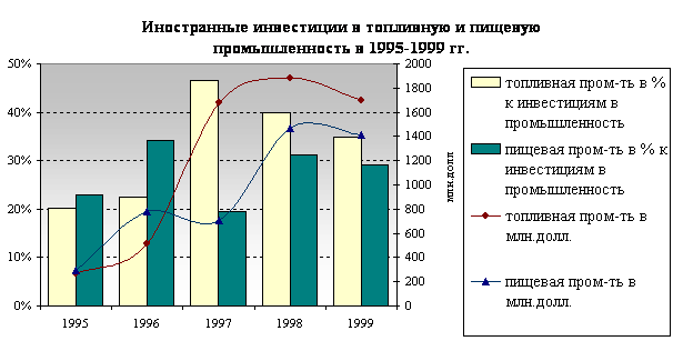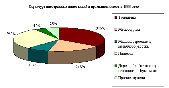 Изменение структуры инвестиций в сферу производства в 1999 году произошло за счет переориентации инвесторов с рынка капиталов на инвестиции в экспортные отрасли России и, прежде всего, в топливную промышленность, а также существенного увеличения вложений в пищевую промышленность. Так, на топливную и пищевую промышленность в 1999 году пришлось 82,7% объема иностранных вложений от прямых инвесторов, направляемых в промышленность.
