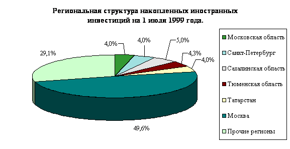 Экономическое развитие российских регионов характеризуется углублением межрегиональных контрастов и продолжающейся концентрацией деятельности иностранных инвесторов в ограниченном числе наиболее динамично развивающихся и стабильных субъектов Российской Федерации. На региональной структуре иностранных инвестиций сказалось их преимущественное привлечение в предприятия ТЭК. Устойчиво сохраняется значимость Москвы, а также Санкт-Петербурга и Московской области как центров деловой активности. Третьим центром притяжения являются приграничные области, такие как Калининградская область, Приморский край.