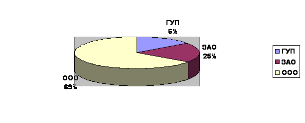 Прибегнув к графическому методу анализа, мы увидели, что на рынке турфирм г.Сыктывкара в процентном отношении преобладает организационно-правовая форма ООО – 69%, в два раза меньше ЗАО – 25%, и на последнем месте ГУП – 6%.