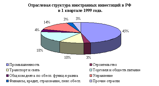 Снижение объемов иностранных инвестиций в российскую экономику в 1 квартале 1999 году произошло за счет значительного сокращения (в 3,4 раза) прочих инвестиций, формируемых в основном за счет кредитов. Торговые кредиты за данный период времени сократились почти в 9 раз. Несмотря на сокращение активности иностранных инвесторов в предоставлении России кредитов, на прочие инвестиции приходится основная доля совокупного объема капиталовложений в 1 квартале 1999 года (61%).
