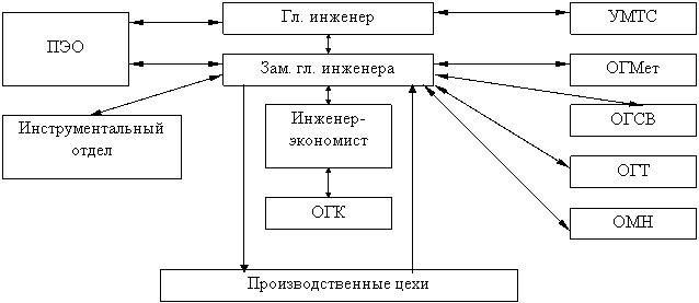 Как видно из приведенной организационной структуры управления, между звеньями управления существует как прямая, так и обратная связь. Информация от одного звена орг. структуры передается др. и т.д. Это позволяет оперативно решать вопросы по разработке конструкторско-технологической документации, по изготовлению и испытанию опытных образцов и оснащенности производства при запуске новых видов продукции.