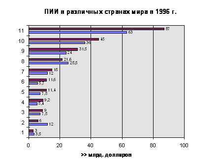Накопленный же объем иностранных инвестиций в экономику России к середине 1996 г., составлял 10,7 млрд. долл. (примерно 15-е место в мире). На ее долю приходилось около 10 % общего объема мировых прямых зарубежных инвестиций.