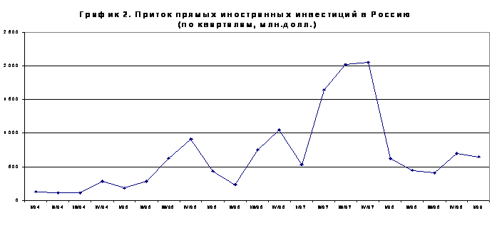 Объём прямых иностранных инвестиций, привлеченных Россией за годы реформ, немногим превышает 10 млрд. долл. (см. График 1), что по меркам российской экономики является очень небольшой суммой.