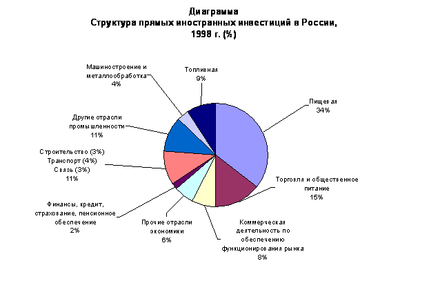 Серьезную проблему составляют не только малые объёмы иностранных инвестиций, но их структура. Глубокие диспропорции существуют в их распределении по отраслям. Главными сферами, куда направляются прямые инвестиции (см. Диаграмму 1), являются пищевая промышленность, торговля и общественное питание, топливная промышленность, общая коммерческая деятельность по обеспечению функционирования рынка (типа продажи ценных бумаг, оказания посреднических услуг, рекламы, представительства, аудита, маркетинга).