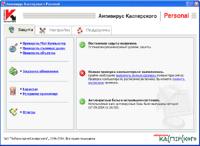 Безусловно, самый популярный и мощный из отечественных антивирусов, да и на мировой антивирусной сцене он котируется весьма высоко. Программа «подстроена» под российскую «вирусную атмосферу» и способна дать отпор вирусам отечественного производства (когда ещё они доберутся до лабораторий западных борцов с вирусами?). Кстати, антивирусная база KAV в данный момент насчитывает около 96000 вирусов, при этом новые дополнения к программе выпускаются ежедневно.