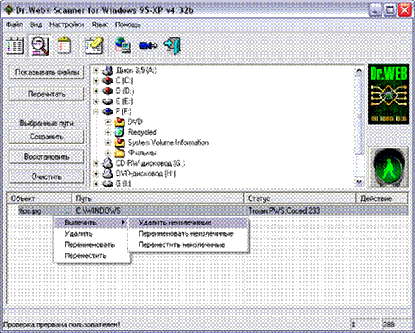 Dr.Web проверяет все категории файлов, которые могут быть заражены: исполняемые файлы, документы Microsoft Word, архивы всех популярных форматов (ARJ, ZIP, RAR, TAR и так далее), скрипты VBS и многие другие.