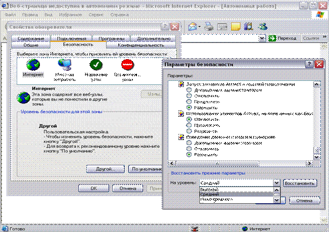 Вернёмся на минутку к настройкам Internet Explorer, - а именно в меню Сервис/ Свойства обозревателя/ Безопасность. Internet Explorer предлагает нам несколько уровней безопасности. Помимо стандартного уровня защиты (зона Интернет) мы можем усилить (зона Ограничить) или ослабить свою бдительность (зона Надёжные узлы). Нажав кнопку Другой, мы можем вручную отрегулировать защиту браузера.