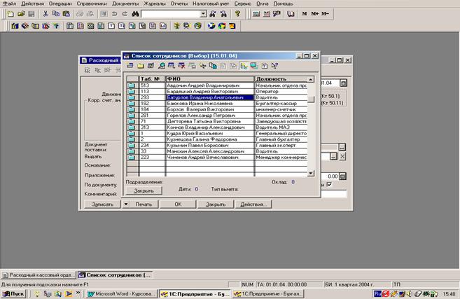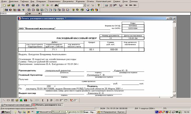 В поле «Основание» указываем содержание хозяйственной операции, в результате которой деньги выдали из кассы. В нашем случае деньги выдали из кассы в подотчет на хозяйственные расходы. В поле «Приложение» указывается документ, прилагаемый к расходному кассовому ордеру: заявление В. А. Батурлова от 15.01.04г. (приложение 2).