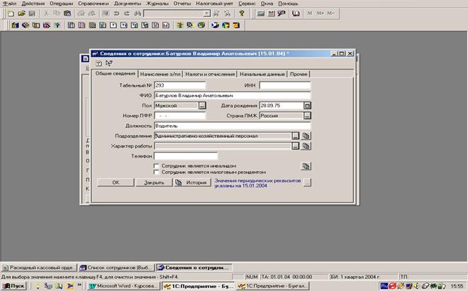 Интерфейс диалогового окна «Сведения о сотруднике» имеет пять вкладок (Общие сведения, Начисление з/п, Налоги и отчисления, Начальные данные и Прочее). В каждую из этих пяти вкладок вносится информация о сотруднике.