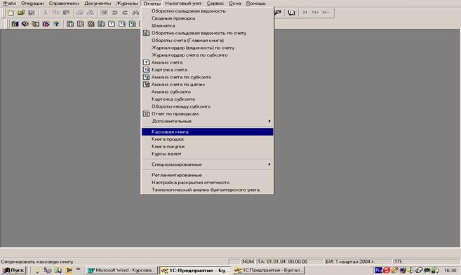 3. Основной этап является завершающим в работе с программой и связан с получением различных отчетов. В типовой конфигурации программы «1С: Предприятие» имеется большое число стандартных отчетов, позволяющих производить всесторонний анализ и контроль учетной информации. Данные отчеты позволяют выявить ошибки учета, анализировать хозяйственную деятельность предприятия за любой период времени.
