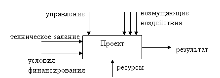 В системном плане проект может быть представлен черным ящиком, входом в который являются технические требования и условия финансирования, а итогом работы – достижение требуемого результата. Выполнение работ обеспечивается наличием необходимых ресурсов: материалов, оборудования, работников.