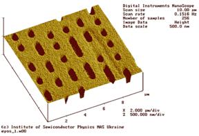 Всем известно, что информация на компакт-диске («настоящем», который называется CD-ROM) представляется в виде «питов» (pit – яма, углубление). Внешний вид основы (до нанесения отражающего слоя) приведён на рис. 2. Трёхмерное изображение поверхности основы CD-ROM построено по результатам измерений, проведенных в лаборатории атомно-силовой микроскопии Института физики полупроводников Национальной академии наук Украины. Измерения выполнены с помощью атомно-силового микроскопа (Atomic Force Microscope) NanoScope IIIa фирмы Digital Instruments.