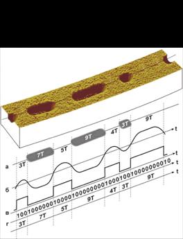 Размеры каждого пита чрезвычайно малы, меньше диаметра сфокусированного пятна лазера. Поэтому ток фотоприёмника не мгновенно появляется и исчезает, а плавно изменяется от минимального до максимального значения. Это так называемый высокочастотный информационный сигнал.