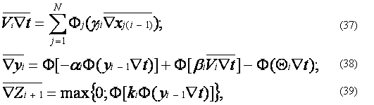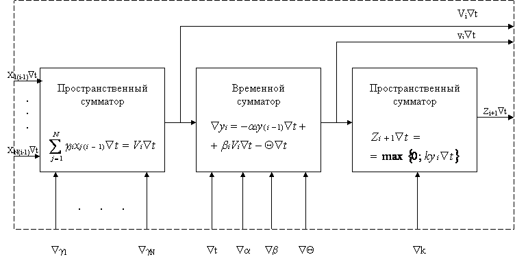 На основании разностного алгоритма (34–36) можно сделать вывод о том, что с целью упрощения ЦНП его схему целесообразно строить на базе цифровых интеграторов, реализующих формулу прямоугольников. Связано это с тем, что при работе ЦНП в режиме ЦНЭ нет смысла применять более точные формулы интегрирования, чем формула Эйлера, а возникающая при его работе в качестве процессорного элемента нейрокомпьютеров погрешность может быть существенно уменьшена, если отдельные ЦНП и нейрокомпьютер в целом использовать в квазистационарном режиме. В целом структура ЦНП должна соответствовать блок-схеме, приведенной на рисунке 14, где наряду с информационными входами и входами приращений параметров предусмотрены как минимум три выхода, а именно выходы приращений ViÑt, yiÑt, Zi+1Ñt. Все эти выходы должны содержать квантователи и допускать возможность их подсоединения как к информационным, так и управляющим входам изменения параметров аналогичных процессоров. В связи с тем, что каждый квантователь содержит определенное оборудование и вносит некоторую погрешность в процесс функционирования ЦНП, вопрос о количестве квантователей и о месте их включения в схеме6 процессора является весьма важным.