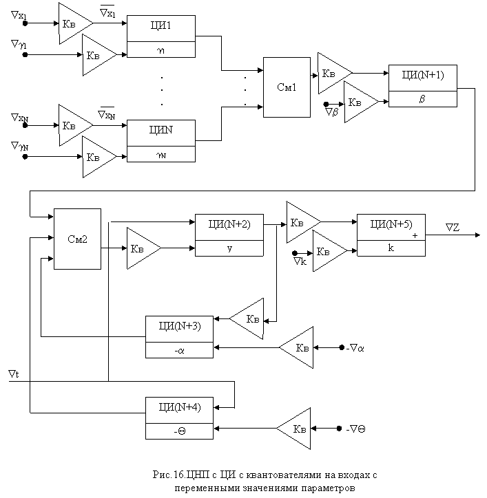 Как видно из рисунка, N-входовый ЦНП содержит всего лишь N+4 квантователя. Однако эта структура построена в предположении постоянства параметров a, b, gj, Q, k, которые, в общем случае, могут быть переменными. Поэтому структура с квантователями на входах должна быть более сложной и иметь вид, показанный на рис. 16. Из рисунка 16 следует, что рассматриваемая структура содержит не 4+N, а 2(4+N) квантователей. Кроме того, такая структура менее удобна по сравнению со структурой ЦНП с квантователями на выходах, поскольку предполагает передачу между процессорами неквантованных приращений.