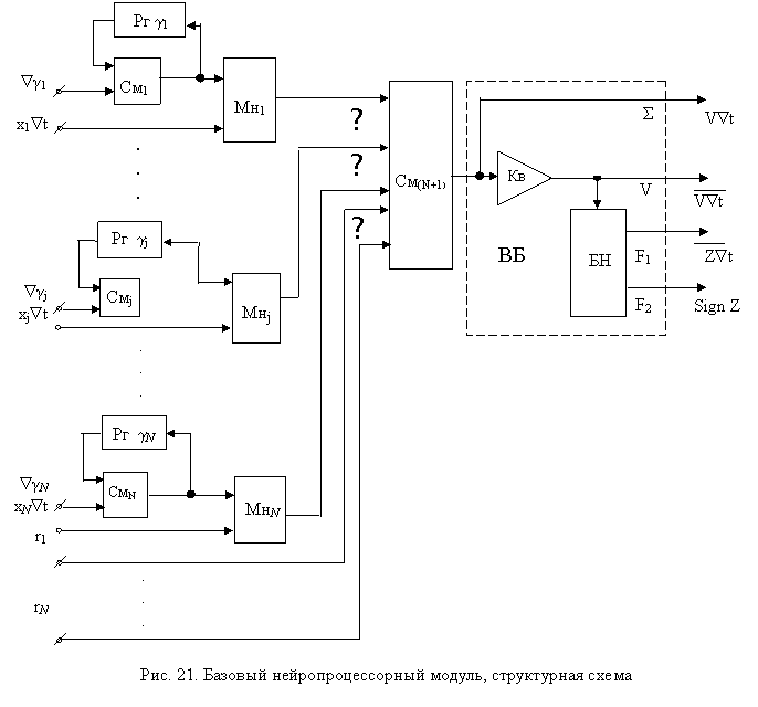 Таким образом, отдельный БНМ действительно может работать в режиме формального нейрона, пространственного и временного сумматора. Структурная схема такого БНМ показана на рис. 21. Из рисунка видно, что в общем случае модуль содержит N синаптических блоков, каждый из которых состоит из умножителя Мнj , регистра Рг gj синаптического веса g j и двухвходового сумматора Смj, суммирующего значения весовых коэффициентов gji с их приращениями Ñgji. На первые входы умножителей Мн j поступают входные воздействия xj(i-1)Ñt с выходов других БНМ или от периферийного оборудования, связанного с внешней средой. Произведения gji(xj(i-1)Ñt) суммируются многовходовым пространственным сумматором См(N+1) и в виде результирующей величины ViÑt поступают на выход модуля, а также на вход квантователя Кв.