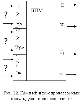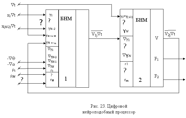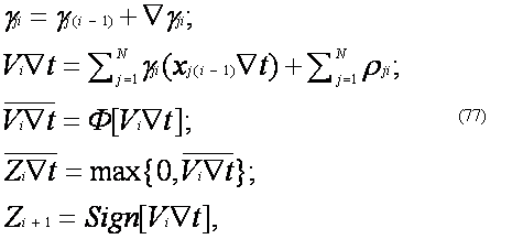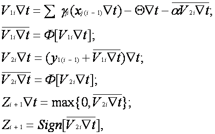 Сравнивая уравнения системы (79) с математическим описанием информационных процессов в цифровой модели нейрона, найдем, что относительно выходной функции Zi+1Ñt система (79) действительно совпадает с алгоритмом нейропроцессора динамического типа. Относительно выходной функции Zi+1 отдельный БНМ работает в режиме обычного формального нейрона.