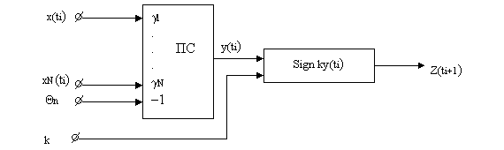 Блок-схема формального нейрона приведена на рисунке 2. Она содержит два блока: блок пространственной суммации (ПС) и блок формирования выходной функции sign ky(ti), который, в свою очередь, может быть построен по импульсному или статическому типу. В первом случае при выполнении условия возбуждения нейрона (ky(ti)³0) на выходе появляется единичный сигнал Z(ti+1) = e(t) априори заданной длительности t. После окончания этого сигнала ФН переходит в невозбужденное состояние и остается в нем до следующего выполнения условия возбуждения. Во втором случае при выполнении условия ky(ti)³0 нейрон переходит в единичное состояние и остается в нем до нарушения условия возбуждения.