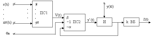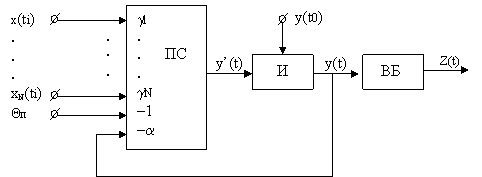 Блок-схема динамического нейрона, работающего в соответствии с алгоритмом (12), приведена на рисунке 3. Наряду с пространственным сумматором ПС1, формирующим сумму V(t) произведений gjxj(t), и пространственным сумматором ПС2, вычисляющим производную y’(t), в схеме ДН предусмотрен интегрирующий блок И для определения функции y(t), а также выходной блок ВБ, формирующий выходную зависимость Z(t).