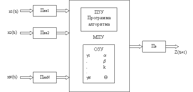 Данная структура состоит из микропроцессорного устройства МПУ и подключенных к нему N портов ввода Пввj (j = 1, N) и одного порта вывода Пв. Она соответствует тому случаю, когда параметры gj ,b, k нейроподобной модели являются постоянными. Предполагается также и то, что программа алгоритма (12) хранится в постоянном запоминающем устройстве ПЗУ, а параметры, которые не меняются в процессе работы конкретной модели цифрового нейрона, но могут быть различными у разных ЦН, хранятся в оперативной памяти МПУ.