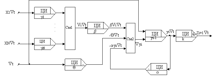 Цифровой нейроэлемент, воспроизводящий этот алгоритм на основе ЦИ, приведен на рис. 11, где знак Å в последнем правом ЦИ обозначает операцию выделения положительных значений kyiÑt(max{0; k(yiÑt)}).