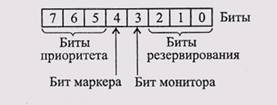 Байт управления разделен на четыре поля (рис. 5.9): три бита приоритета, бит маркера, бит монитора и три бита резервирования. Биты приоритета позволяют абоненту присваивать приоритет своим пакетам или маркеру (приоритет может быть от 0 до 7, причем 7 соответствует наивысшему приоритету, а 0 — наинизшему). Абонент может присоединить к маркеру свой пакет только тогда, когда его собственный приоритет такой же или выше приоритета маркера. Бит маркера определяет, присоединен ли к маркеру пакет (единица соответствует маркеру без пакета, нуль - маркеру с пакетом). Бит монитора, установленный в единицу, говорит о том, что данный маркер передан активным монитором. Биты резервирования позволяют абоненту зарезервировать свое право на дальнейший захват сети, то есть, так сказать, занять очередь на обслуживание. Если приоритет абонента выше, чем текущее значение поля резервирования, он может записать туда свой приоритет вместо прежнего.
