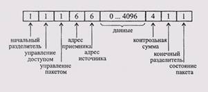 Формат пакета Token-Ring представлен на рис. 5.10. Помимо начального и конечного разделителей, а также байта управления доступом, в пакет входят также байт управления пакетом, сетевые адреса приемника и передатчика, данные, контрольная сумма и байт состояния,пакета.