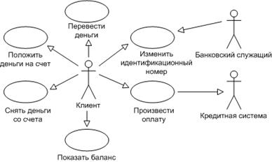 Ha диаграмме представлено взаимодействие между вариантами использования и действующими лицами. Она отражает требования к системе с точки зрения пользователя. Таким образом, варианты использования — это функции, выполняемые системой, а действующие лица — это заинтересованные лица (stakeholders) по отношению к создаваемой системе. Диаграммы показывают, какие действующие лица инициируют варианты использования. Из них также видно, когда действующее лицо получает информацию от варианта использования. В сущности, диаграмма Вариантов Использования может иллюстрировать требования к системе. В нашем примере клиент банка инициирует различные варианты использования: Снять деньги со счета, Перевести деньги, Положить деньги на счет, Показать баланс, Изменить идентификационный номер, Произвести оплату. Банковский служащий может инициировать вариант использования "Изменить идентификационный номер". От варианта использования "Произвести оплату" идет стрелка к Кредитной системе. Действующими лицами могут быть и внешние системы, в данном случае Кредитная система показана именно как действующее лицо — она является внешней для системы ATM. Стрелка, направленная от варианта использования к действующему лицу, показывает, что вариант использования предоставляет некоторую информацию действующему лицу. В данном случае вариант использования "Произвести оплату" предоставляет Кредитной системе информацию об оплате по кредитной карточке.