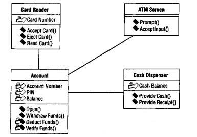 Диаграммы Классов отражают взаимодействие между классами системы. Классы можно рассматривать как типы объектов . Например, счет клиента — это объект. Типом такого объекта можно считать счет вообще, т.е. "Счет" (Account) — это класс. Классы содержат данные и поведение (действия), влияющее на эти данные. Так, класс Account содержит идентификационный номер клиента и проверяющие его действия. На диаграмме Классов класс создается для каждого типа объектов из диаграмм Последовательности или Кооперативных диаграмм. Диаграмма Классов для варианта использования "Снять деньги" показана на рис.