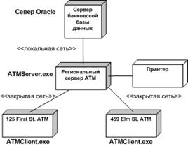 Из данной диаграммы можно узнать о физическом размещении системы. Клиентские программы ATM будут работать в нескольких местах на различных сайтах. Через закрытые сети будет осуществляться сообщение клиентов с региональным сервером ATM. На нем будет работать программное обеспечение сервера ATM. В свою очередь, посредством локальной сети региональный сервер будет взаимодействовать с сервером банковской базы данных, работающим под управлением Oracle. Наконец с региональным сервером ATM соединен принтер.