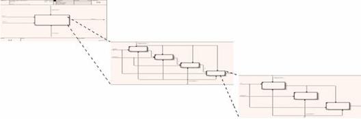 · SADT (Structured Analysis and Design Technique). Для новых систем SADT (IDEF0) применяется для определения требований (функций) для разработки системы, реализующей выделенные функции. Для уже существующих - IDEF0 может быть использована для анализа функций, выполняемых системой. Модель в нотации IDEF0 представляет собой совокупность иерархически упорядоченных и взаимосвязанных диаграмм (рис.1). Вершина этой древовидной структуры, представляющая собой самое общее описание системы. После описания системы в целом проводится разбиение ее на крупные фрагменты (функциональная декомпозиция).
