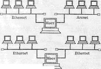 Мосты - наиболее простые устройства, служащие для объединения сетей с разными стандартами обмена, например Ethernet и Arcnet, или нескольких сегментов (частей) одной и той же сети, например Ethernet (рис. 4.6). В последнем случае мост служит только для разделения нагрузок сегментов, повышая тем самым производительность сети в целом. В отличие от коммутирующих концентраторов, мосты принимают поступающие пакеты целиком и в случае необходимости производят их простейшую обработку.