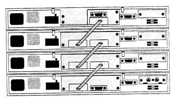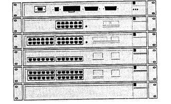 Рис. 4.13. Объединение стековых концентраторов в единое устройство с помощью специальных разъемов на задней панели Если стековые концентраторы имеют несколько внутренних шин, то при соединении в стек эти шины объединяются и становятся общими для всех устройств стека. Число объединяемых в стек корпусов может быть достаточно большим (обычно до 8, но бывает и больше). Стековые концентраторы могут поддерживать различные физические среды передачи, что делает их почти такими же гибкими, как и модульные концентраторы, но при этом стоимость этих устройств в расчете на один порт получается обычно ниже, так как сначала предприятие может купить одно устройство без избыточного шасси, а потом нарастить стек еще несколькими аналогичными устройствами. Стековые концентраторы, выпускаемые одним производителем, выполняются в едином конструктивном стандарте, что позволяет легко устанавливать их друг на друга, образуя единое настольное устройство, или помещать их в общую стойку. Экономия при организации стека происходит еще и за счет единого для всех устройств стека модуля SNMP-управления (который вставляется в один из корпусов стека как дополнительный модуль), а также общего избыточного источника питания. Модульно-стековые концентраторы представляют собой модульные концентраторы, объединенные специальными связями в стек. Как правило, корпуса таких концентраторов рассчитаны на небольшое количество модулей (1-3). Эти концентраторы сочетают достоинства концентраторов обоих типов.
