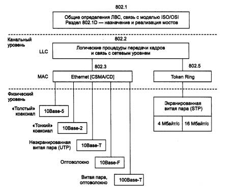 управления доступом к среде (Media Access Control, MAC). Уровень MAC появился из-за существования в локальных сетях разделяемой среды передачи данных. Именно этот уровень обеспечивает корректное совместное использование общей среды, предоставляя ее в соответствии с определенным алгоритмом в распоряжение той или иной станции сети. После того как доступ к среде получен, ею может пользоваться более высокий уровень - уровень LLC, организующий передачу логических единиц данных, кадров информации, с различным уровнем качества транспортных услуг. В современных локальных сетях получили распространение несколько протоколов уровня MAC, реализующих различные алгоритмы доступа к разделяемой среде. Эти протоколы полностью определяют специфику таких технологий, как Ethernet, Fast Ethernet, Gigabit Ethernet, Token Ring, FDDI, l00VG-AnyLAN. Уровень LLC отвечает за передачу кадров данных между узлами с различной степенью надежности, а также реализует функции интерфейса с прилегающим к нему сетевым уровнем. Именно через уровень LLC сетевой протокол запрашивает у канального уровня нужную ему транспортную операцию с нужным качеством. На уровне LLC существует несколько режимов работы, отличающихся наличием или отсутствием на этом уровне процедур восстановления кадров в случае их потери или искажения, то есть отличающихся качеством транспортных услуг этого уровня. Протоколы уровней MAC и LLC взаимно независимы - каждый протокол уровня MAC может применяться с любым протоколом уровня LLC, и наоборот. Стандарты IEEE 802 имеют достаточно четкую структуру, приведенную на рис. 3.1: