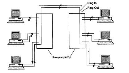 Рис. 3.15. Физическая конфигурация сети Token Ring Концентратор Token Ring может быть активным или пассивным. Пассивный концентратор просто соединяет порты внутренними связями так, чтобы станции, подключаемые к этим портам, образовали кольцо. Ни усиление сигналов, ни их ресинхронизацию пассивный MSAU не выполняет. Такое устройство можно считать простым кроссовым блоком за одним исключением - MSAU обеспечивает обход какого-либо порта, когда присоединенный к этому порту компьютер выключают. Такая функция необходима для обеспечения связности кольца вне зависимости от состояния подключенных компьютеров. Обычно обход порта выполняется за счет релейных схем, которые питаются постоянным током от сетевого адаптера, а при выключении сетевого адаптера нормально замкнутые контакты реле соединяют вход порта с его выходом. Активный концентратор выполняет функции регенерации сигналов и поэтому иногда называется повторителем, как в стандарте Ethernet. Возникает вопрос - если концентратор является пассивным устройством, то каким образом обеспечивается качественная передача сигналов на большие расстояния, которые возникают при включении в сеть нескольких сот компьютеров? Ответ состоит в том, что роль усилителя сигналов в этом случае берет на себя каждый сетевой адаптер, а роль ресинхронизирующего блока выполняет сетевой адаптер активного монитора кольца. Каждый сетевой адаптер Token Ring имеет блок повторения, который умеет регенерировать и ресинхронизировать сигналы, однако последнюю функцию выполняет в кольце только блок повторения активного монитора. Блок ресинхронизации состоит из 30-битного буфера, который принимает манчестерские сигналы с несколько искаженными за время оборота по кольцу интервалами следования. При максимальном количестве станций в кольце (260) вариация задержки циркуляции бита по кольцу может достигать 3-битовых интервалов. Активный монитор «вставляет» свой буфер в кольцо и синхронизирует битовые сигналы, выдавая их на выход с требуемой частотой. В общем случае сеть Token Ring имеет комбинированную звездно-кольцевую конфигурацию. Конечные узлы подключаются к MSAU по топологии звезды, а сами MSAU объединяются через специальные порты Ring In (RI) и Ring Out (RO) для образования магистрального физического кольца. Все станции в кольце должны работать на одной скорости - либо 4 Мбит/с, либо 16 Мбит/с. Кабели, соединяющие станцию с концентратором, называются ответвительными (lobe cable), а кабели, соединяющие концентраторы, - магистральными (trunk cable). Технология Token Ring позволяет использовать для соединения конечных станций и концентраторов различные типы кабеля: STP Type I, UTP Type 3, UTP Type 6, а также волоконно-оптический кабель. При использовании экранированной витой пары STP Type 1 из номенклатуры кабельной системы IBM в кольцо допускается объединять до 260 станций при длине ответвительных кабелей до 100 метров, а при использовании неэкранированной витой пары максимальное количество станций сокращается до 72 при длине ответвительных кабелей до 45 метров. Расстояние между пассивными MSAU может достигать 100 м при использовании кабеля STP Type 1 и 45 м при использовании кабеля UTP Type 3. Между активными MSAU максимальное расстояние увеличивается соответственно до 730 м или 365 м в зависимости от типа кабеля. Максимальная длина кольца Token Ring составляет 4000 м. Ограничения на максимальную дл