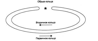 · максимально эффективно использовать потенциальную пропускную способность сети как для асинхронного, так и для синхронного (чувствительного к задержкам) трафиков. Сеть FDDI строится на основе двух оптоволоконных колец, которые образуют основной и резервный пути передачи данных между узлами сети. Наличие двух колец - это основной способ повышения отказоустойчивости в сети FDDI, и узлы, которые хотят воспользоваться этим повышенным потенциалом надежности, должны быть подключены к обоим кольцам. В нормальном режиме работы сети данные проходят через все узлы и все участки кабеля только первичного (Primary) кольца, этот режим назван режимом Thru - «сквозным» или «транзитным». Вторичное кольцо (Secondary) в этом режиме не используется. В случае какого-либо вида отказа, когда часть первичного кольца не может передавать данные (например, обрыв кабеля или отказ узла), первичное кольцо объединяется со вторичным (рис. 3.16), вновь образуя единое кольцо. Этот режим работы сети называется Wrap, то есть «свертывание» или «сворачивание» колец. Операция свертывания производится средствами концентраторов и/или сетевых адаптеров FDDI. Для упрощения этой процедуры данные по первичному кольцу всегда передаются в одном направлении (на диаграммах это направление изображается против часовой стрелки), а по вторичному - в обратном (изображается по часовой стрелке). Поэтому при образовании общего кольца из двух колец передатчики станций по-прежнему остаются подключенными к приемникам соседних станций, что позволяет правильно передавать и принимать информацию соседними станциями.