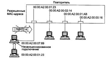 Защита от несанкционированного доступа Разделяемая среда предоставляет очень удобную возможность для несанкционированного прослушивания сети и получения доступа к передаваемым данным. Для этого достаточно подключить компьютер с программным анализатором протоколов к свободному разъему концентратора, записать на диск весь проходящий по сети трафик, а затем выделить из него нужную информацию. Разработчики концентраторов предоставляют некоторый способ защиты данных в разделяемых средах. Наиболее простой способ - назначение разрешенных МАС - адресов портам концентратора. В стандартном концентраторе Ethernet порты МАС - адресов не имеют. Защита заключается в том, что администратор вручную связывает с каждым портом концентратора некоторый МАС - адрес. Этот МАС - адрес является адресом станции, которой разрешается подключаться к данному порту. Например, на рис. 4.8 первому порту концентратора назначен МАС - адрес 123 (условная запись). Компьютер с МАС - адресом 123 нормально работает с сетью через данный порт. Если злоумышленник отсоединяет этот компьютер и присоединяет вместо него свой, концентратор заметит, что при старте нового компьютера в сеть начали поступать кадры с адресом источника 789. Так как этот адрес является недопустимым для первого порта, то эти кадры фильтруются, порт отключается, а факт нарушения прав доступа может быть зафиксирован.