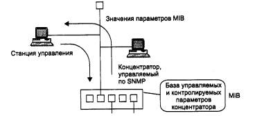 Управление концентратором по протоколу SNMP Как видно из описания дополнительных функций, многие из них требуют конфигурирования концентратора. Это конфигурирование может производиться локально, через интерфейс RS-232C, который имеется у любого концентратора, имеющего блок управления. Кроме конфигурирования в большой сети очень полезна функция наблюдения за состоянием концентратора: работоспособен ли он, в каком состоянии находятся его порты. При большом количестве концентраторов и других коммуникационных устройств в сети постоянное наблюдение за состоянием многочисленных портов и изменением их параметров становится очень обременительным занятием, если оно должно выполняться с помощью локального подключения терминала. Поэтому большинство концентраторов, поддерживающих интеллектуальные дополнительные функции, могут управляться централизованно по сети с помощью популярного протокола управления SNMP (Simple Network Management Protocol) из стека TCP/IP. Упрощенная структура системы управления изображена на рис.4.11.