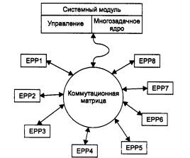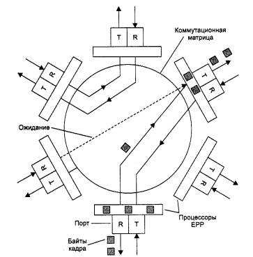 Рис. 4.23. Структура коммутатора EtherSwitch компании Ка1рапа Каждый из 8 портов 10Base-T обслуживается одним процессором пакетов Ethernet - ЕРР (Ethernet Packet Processor). Кроме того, коммутатор имеет системный модуль, который координирует работу всех процессоров ЕРР. Системный модуль ведет общую адресную таблицу коммутатора и обеспечивает управление коммутатором по протоколу SNMP. Для передачи кадров между портами используется коммутационная матрица, подобная тем, которые работают в телефонных коммутаторах или мультипроцессорных компьютерах, соединяя несколько процессоров с несколькими модулями памяти. Коммутационная матрица работает по принципу коммутации каналов. Для 8 портов матрица может обеспечить 8 одновременных внутренних каналов при полудуплексном режиме работы портов и 16 - при полнодуплексном, когда передатчик и приемник каждого порта работают независимо друг от друга. При поступлении кадра в какой-либо порт процессор ЕРР буферизует несколько первых байт кадра, чтобы прочитать адрес назначения. После получения адреса назначения процессор сразу же принимает решение о передаче пакета, не дожидаясь прихода остальных байт кадра. Для этого он просматривает свой собственный кэш адресной таблицы, а если не находит там нужного адреса, обращается к системному модулю, который работает в многозадачном режиме, параллельно обслуживая запросы всех процессоров ЕРР. Системный модуль производит просмотр общей адресной таблицы и возвращает процессору найденную строку, которую тот буферизует в своем кэше для последующего использования. После нахождения адреса назначения процессор ЕРР знает, что нужно дальше делать с поступающим кадром (во время просмотра адресной таблицы процессор продолжал буферизацию поступающих в порт байтов кадра). Если кадр нужно отфильтровать, процессор просто прекращает записывать в буфер байты кадра, очищает буфер и ждет поступления нового кадра. Если же кадр нужно передать на другой порт, то процессор обращается к коммутационной матрице и пытается установить в ней путь, связывающий его порт с портом, через который идет маршрут к адресу назначения. Коммутационная матрица может это сделать только в том случае, когда порт адреса назначения в этот момент свободен, то есть не соединен с другим портом. Если же порт занят, то, как и в любом устройстве с коммутацией каналов, матрица в соединении отказывает. В этом случае кадр полностью буферизуется процессором входного порта, после чего процессор ожидает освобождения выходного порта и образования коммутационной матрицей нужного пути. После того как нужный путь установлен, в него направляются буферизованные байты кадра, которые принимаются процессором выходного порта. Как только процессор выходного порта получает доступ к подключенному к нему сегменту Ethernet по алгоритму CSMA/CD, байты кадра сразу же начинают передаваться в сеть. Процессор входного порта постоянно хранит несколько байт принимаемого кадра в своем буфере, что позволяет ему независимо и асинхронно принимать и передавать байты кадра (рис. 4.24).